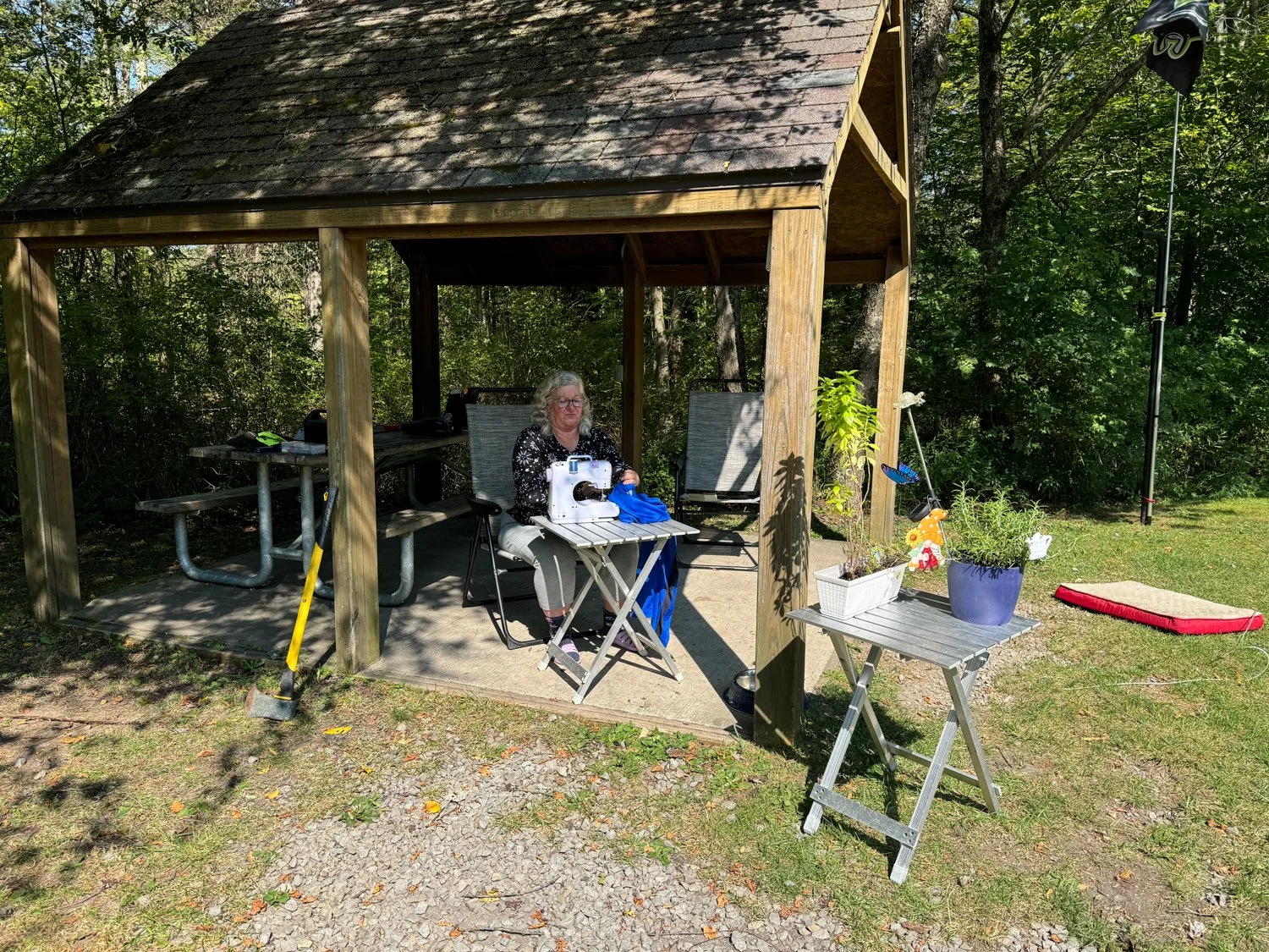 LeeAnn mends pants at our campsite with her portable sewing machine. Our across the street neighbors were pretty interested in it. I'm sure it was quite the sight.